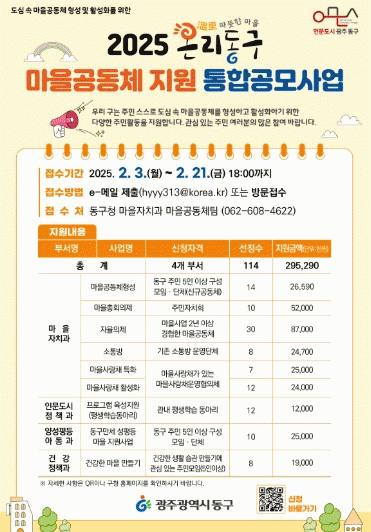 2025 온리동구 마을공동체 지원 통합공모사업에 대한 자세한 내용과 신청 방법은 동구청 누리집을 참고하면 된다.