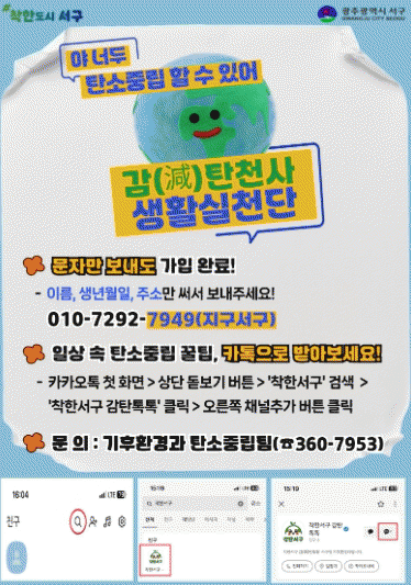 감탄천사 생활실천단은 탄소중립에 관심이 많은 서구민 또는 서구 소재의 학교 학생, 직장인 누구나 문자 메시지(010-7292-7949) 또는 카카오톡 채널(착한서구 감탄톡톡)로 참여 가능하다.