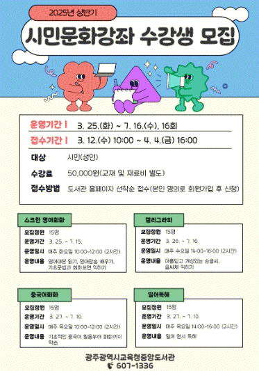 광주중앙도서관은 전문강사진을 초빙해 ▲스크린영어회화 ▲캘리그라피 ▲중국어회화 ▲일어 독해 등 4개 강좌를 개설하고 오는 3월 25일부터 7월 16일까지 운영한다.