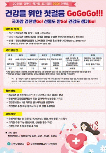 이번 이벤트는 국가암검진을 통해 암을 조기에 발견하고 암의 치료율을 높여 진안군 사망원인 1위인 암 사망률을 감소시키기 위해 진행한다.