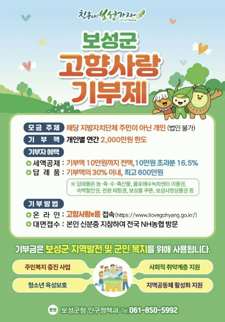 보성군은 2023년 기준, 고향사랑기부제 시행 2년 만에 누적 모금액 7억 2,000만 원을 달성했으며, 답례품으로는 녹돈, 키위, 꼬막, 제암산자연휴양림 숙박 할인권, 율포해수녹차센터 이용권 등 92개 품목을 제공하고 있다.