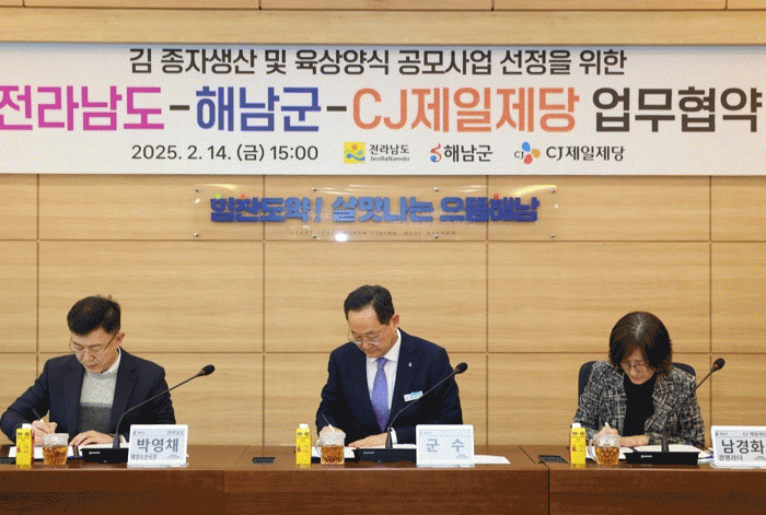 14일 열린 협약식에는 명현관 해남군수, 전라남도 박영채 해양수산국장, CJ제일제당 남경화 글로벌카테고리 연구담당(경영리더) 등 관계자들이 참석한 가운데, 김 육상양식 기술 개발과 산업 육성에 기관과 기업이 긴밀히 협력해 나가기로 했다.