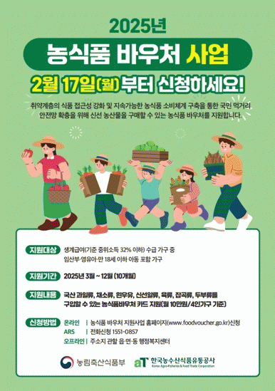 지원 대상은 임산부·영유아·만 18세 이하 아동이 있으며 중위소득 32% 이하의 생계급여 수급 가구로 올해 3월부터 12월까지 10개월간 농식품 바우처 카드를 지원받을 수 있다.