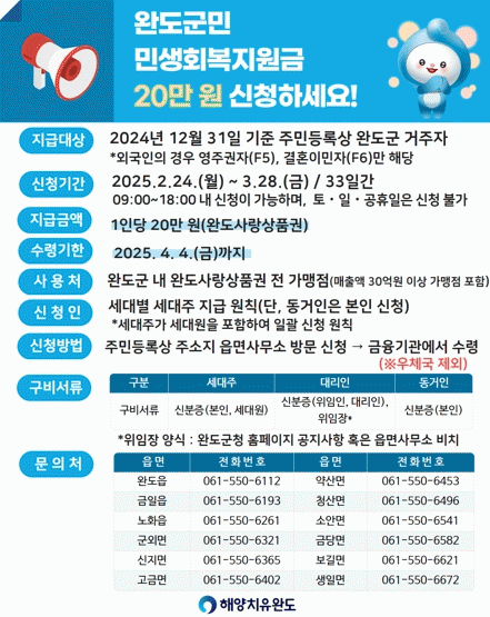 민생회복지원금 신청 대상은 2024년 12월 31일 기준 주민등록상 완도군에 주소를 둔 군민이고, 외국인의 경우 영주권자(F5), 결혼 이민자(F6)만 해당된다.
