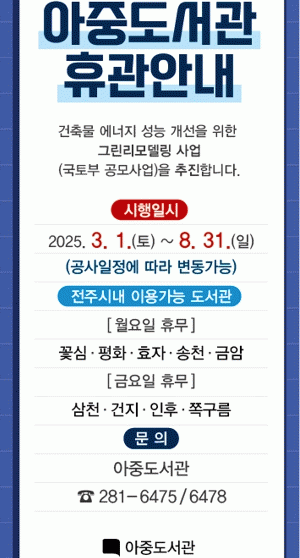 전주시는 오는 3월 1일부터 8월 31일까지 6개월 동안 아중도서관이 그린리모델링 공사를 위해 휴관할 예정이라고 17일 밝혔다.