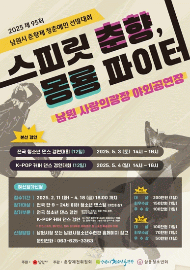 남원시는 제95회 춘향제 기간에 청소년들이 댄스에 대한 끼와 역량을 발휘할 수 있도록 댄스 경연대회 “스피릿 춘향, 몽룡 파이터”를 5월3일부터 5월4일까지 2일간 남원 사랑의 광장 야외공연장에서 개최할 계획이다.