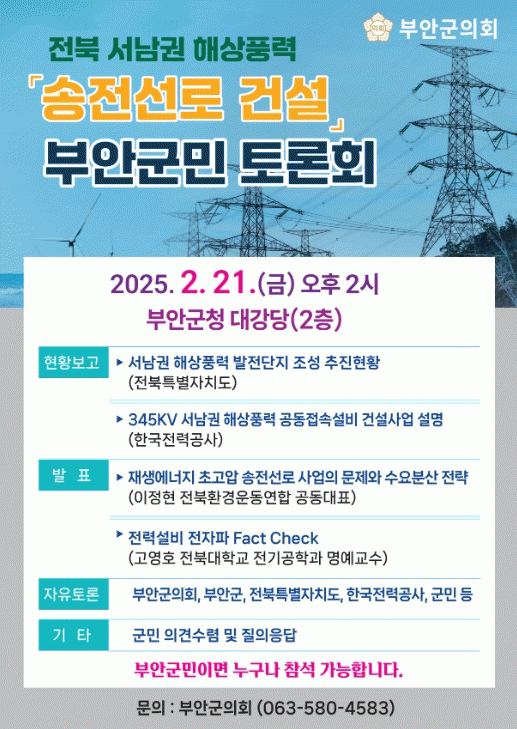 이후 부안군의회, 부안군, 전북특별자치도, 한국전력공사, 군민들이 자유토론을 통해 다양한 의견을 공유하며, 군민들이 직접 질문하고 의견을 개진할 수 있는 시간도 마련되어 있어, 군민들의 궁금증을 해소하는 기회가 될 것으로 보인다.