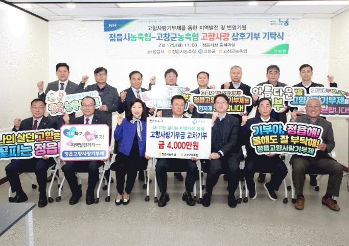 정읍시와 고창군의 농축협 조합장들이 고향사랑기부제 활성화를 위해 4000만원씩 기부하며 지역 발전을 위한 동행을 약속했다.