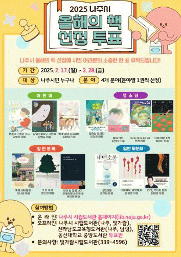 윤병태 나주시장은 “시민들과 함께 책을 선정하고 읽는 과정은 문화적 공감대를 넓히고 독서의 즐거움을 나누는 소중한 기회”라며 “더 많은 시민이 이번 행사에 참여해 ‘책 읽는 나주’ 캠페인이 성공적으로 이어지기를 기대한다”고 전했다.