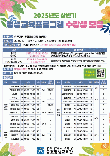 금호평생교육관 선계룡 과장은 “이번 프로그램을 통해 시민들이 배움의 욕구를 충족하고, 역량을 키울 수 있는 기회가 되길 바란다”며 “학습과 삶이 조화를 이루는 평생학습 사회를 만들기 위해 최선을 다하겠다”고 말했다.