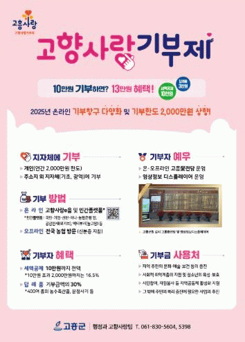 군은 고향사랑기부제 민간 플랫폼인 위기브와의 계약을 통해 다양한 기부 창구를 제공해 기부자의 편의성을 도모하고, 민간 플랫폼의 노하우를 군의 모금 활동에 접목해 기부금 모금에 총력을 다할 예정이다.