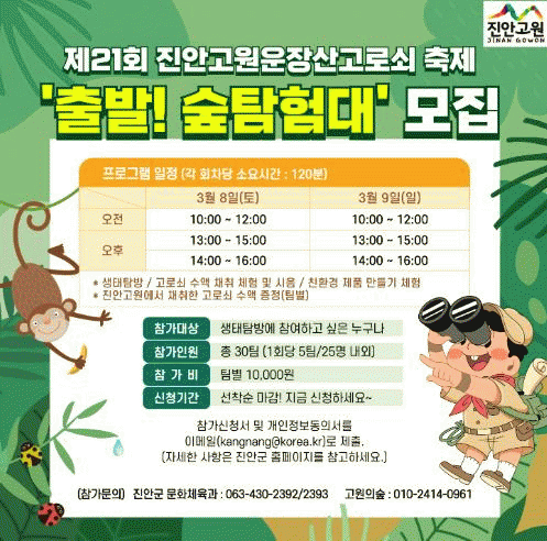프로그램 참가자 모집은 2월 28일까지 선착순으로 진행되며, 진안군 홈페이지공지사항에 게시되어 있는 신청서를 절차에 따라 제출하면 된다.