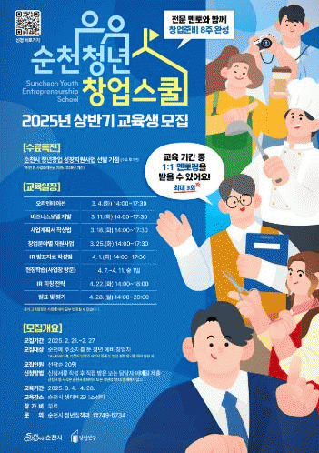 교육비는 무료이며, 교육 수료 후 1년간 순천시 청년창업 성장지원사업 대상자 선발 시 가점 혜택도 주어진다.