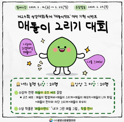 이명만 협의회장은 “제24회 광양매화축제장에 광양의 대표성과 상징성을 담은 인기 캐릭터 ‘매돌이’를 활용한 ‘매돌이랜드’ 체험존 운영을 앞두고 매돌이 그리기 이벤트를 개최한다.”면서 “상상력과 창의력 넘치는 많은 분들의 참여와 참신한 작품을 기대한다”고 말했다.