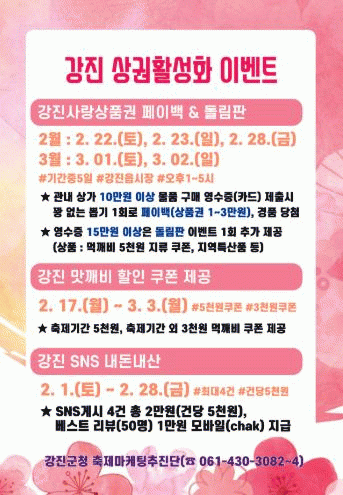 이번 이벤트는 상가 방문 및 소비 촉진 유도와 강진읍 상권의 활력을 불어넣기 위해 진행된다.
