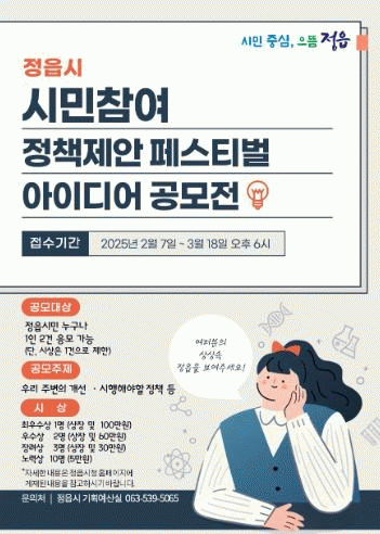 공모 주제는 ▲생활 속 개선이 필요한 정책 ▲생활인구 유입·다자녀 가구 지원 ▲골목상권 활성화 ▲청년 일자리 창출 ▲정읍형 관광·먹거리·축제 활성화 ▲기타 정읍 발전을 위한 창의적 정책 등 정읍 발전과 시민 편의를 높일 수 있는 다양한 분야를 포함한다.
