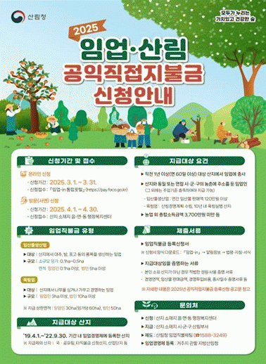 올해는 임업인의 신청 편의를 위해 임업직불금 신청 기간이 1개월 앞당겨지고, 1개월 연장되어 운영된다.