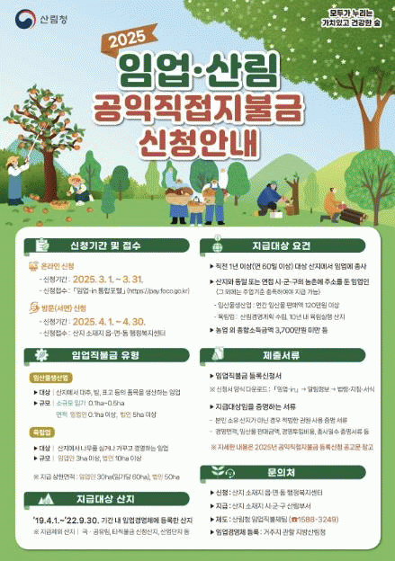 특히, 올해는 임업인의 신청 편의를 위해 임업직불금 신청 기간을 1개월 앞당기고 신청 기간은 1개월 연장해 운영한다.