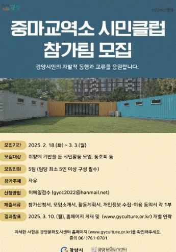 ‘중마교역소 시민클럽’ 참가 신청은 2월 18일부터 3월 3일까지 이메일을 통해 접수하며, 서류 심사를 거쳐 3월 10일 최종 선정 팀을 발표할 예정이다.