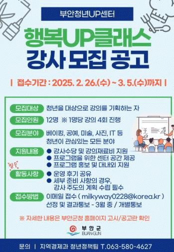 부안군 관계자는 "이번 강사 모집을 통해 진행되는 행복UP클래스 사업은 청년들에게 양질의 배움의 기회를 제공하고, 강사분들에게도 뜻깊은 경험과 지원을 제공할 것"이라며 "많은 강사들의 참여를 기대한다"고 밝혔다.
