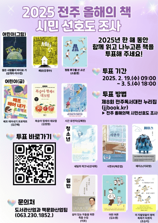 시는 오는 3월 5일까지 시민들이 1년 동안 함께 읽고 공감할 수 있는 ‘2025 전주 올해의 책’을 선정하기 위한 시민 선호도 조사를 실시한다고 19일 밝혔다.