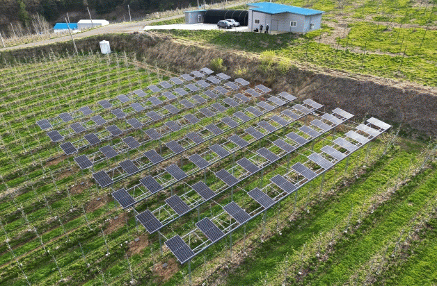 무주군에 따르면 사과 농가들의 재배 형태에 맞게 과원 1,150㎡에 수평형 태양광 발전 시설을 설치했으며 이는 시간당 48kW 내외의 전기를 생산할 수 있는 규모다.