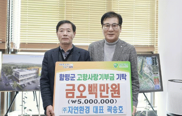 함평군은 20일 “㈜자연환경 곽송호 대표이사가 전날 함평군청을 찾아 고향사랑기부금 500만원을 기탁했다”고 밝혔다.