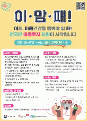 이재연 완주군 보건소장은 “전문 심리상담 서비스를 받을 수 있는 전 국민 마음투자 지원사업에 많은 관심과 신청을 바란다”며 “군민들이 정서적 회복을 할 수 있는 마음이 건강한 완주군이 되도록 최선을 다하겠다”고 말했다.