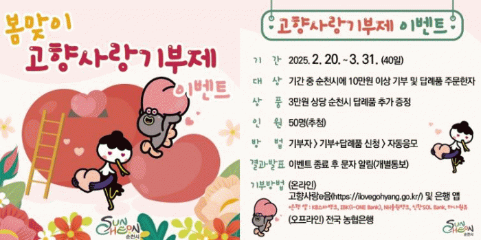 이벤트 기간 동안 순천시에 10만 원 이상 기부하고 답례품 주문까지 완료한 기부자는 자동으로 응모된다.