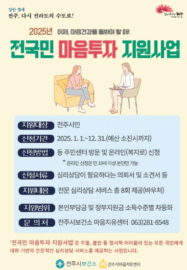 김신선 전주시보건소장은 “마음 건강이 신체 건강만큼 중요해진 시대에 이번 사업이 시민들의 심리적 어려움 해소에 도움이 되길 바란다”면서 “전주시민의 마음 건강을 돌보기 위해 최선을 다할 것”이라고 전했다.