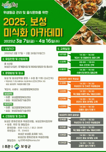 군 관계자는 “‘2025 보성 미식화 아카데미’는 참여 대상을 확대하고, 보성과 벌교권역에서 운영하여 관심과 참여율을 높이고자 한다.”라며, “유명 강사진과 깊이 있는 교육을 통해 많은 미식가 CEO들의 참여를 기대한다.”라고 밝혔다.