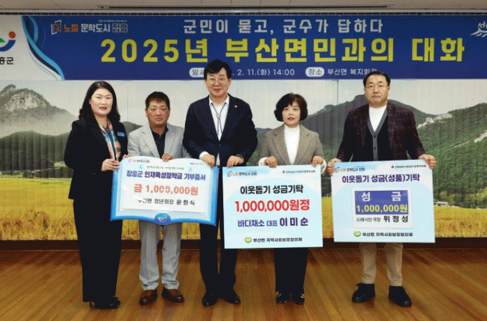 위정성 프레시안 국장은 “작년에 살기 좋은 부산면에 전입을 왔는데, 부산면 주민의 일원으로서 부산면에서 개최된 군민과의 대화라는 뜻깊은 자리에 우리 지역을 위해 성금을 기탁할 수 있어서 영광이다”며, “이 날 모인 작은 정성이 우리 부산면민들에게 뜻깊게 쓰일 수 있도록 당부드린다”고 전했다.