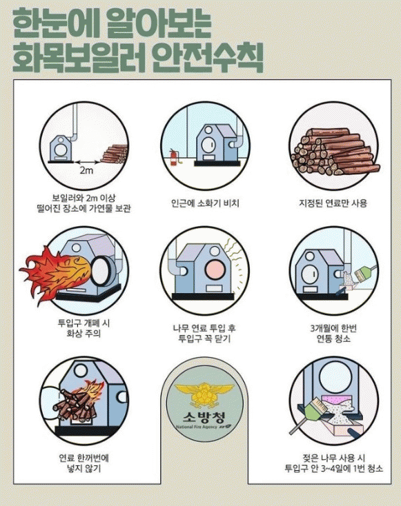 화재없는 따듯한 겨울을 보낼 수 있도록 화목보일러 사용 시 안전수칙을 몇가지 기억하길 바란다. ▲화목보일러는 지정된 연료만 사용 ▲보일러와 2m이상 떨어진 장소에 가연물 보관 ▲연료 한꺼번에 넣기 금지 ▲ 3개월에 한번 연통 청소 ▲나무 연료 투입 후 투입구 꼭 닫기 ▲보일러 인근에 소화기 비치