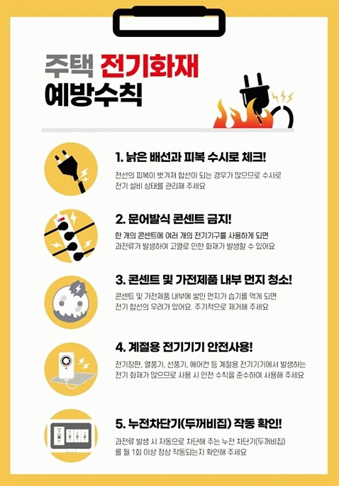 전기화재 예방 안전수칙으로는 ▲문어발식 전기 콘센트 사용 금지 ▲배선,피복 손상 여부 확인 ▲주변 먼지 청소 ▲노후 전기제품 안전성 확인 및 정격 용량에 맞게 사용 ▲누전차단기의 정상 작동 여부 확인 등이 있다.