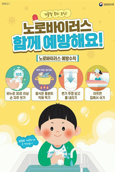 노로바이러스 감염증을 예방하려면 비누로 30초 이상 손을 씻고, 어패류는 충분히 익혀 안전하게 섭취해야 한다.