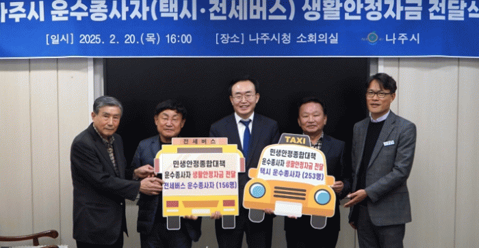 나주시는 20일 시청사 소회의실에서 윤병태 시장과 지역 택시 연합회·지부, 전세버스 회사 대표자들이 참석한 가운데 생활 안정 자금 전달식을 가졌다고 21일 밝혔다.