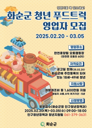 신청 자격은 공고일 기준 화순군 관내 주민등록이 되어 있는 18세 이상 49세 이하인 청년으로 푸드트럭 영업 신고와 운영을 할 수 있는 자다.