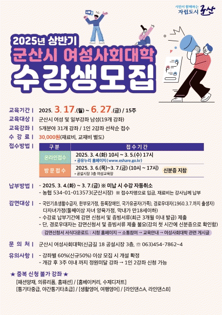 자세한 사항은 군산시 누리집을 확인하거나 여성사회대학으로 문의하면 된다.