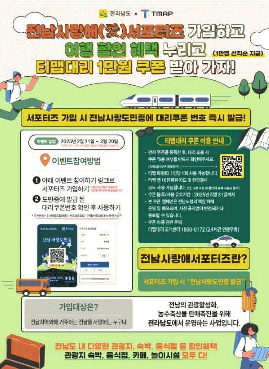 자세한 이벤트 참여 방법은 티맵(TMAP)앱과 전남 사랑애 100만 서포터즈 공식 홈페이지 공지사항에서 확인 가능하다.