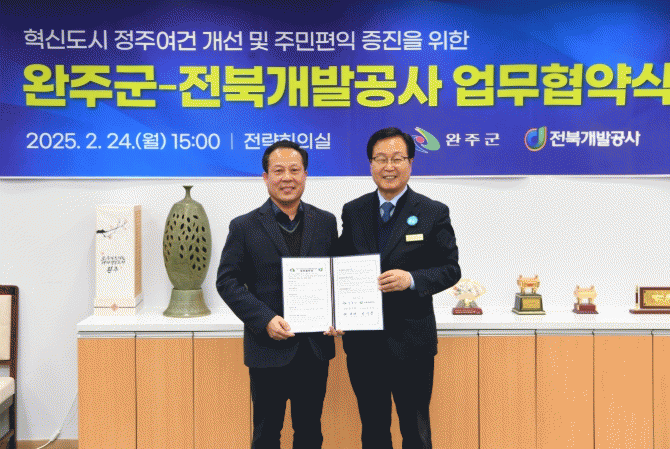 24일 열린 협약식에는 유희태 완주군수와 송재철 전북개발공사장직무대행이 참석해 혁신도시 활성화를 위해 완주 혁신도시 내 ▲공공기관 지방이전과 지역전략산업 연계 협력 ▲주차환경 등 혁신도시 정주여건 개선 및 주민편익 증진도모 ▲혁신도시 내 미분양 부지 활용방안 마련 등 상호 협력을 통해 혁신도시 활성화를 위하여 노력할 것을 합의했다.