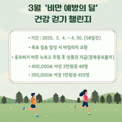 서영옥 광양시 건강증진과장은 “걷기는 체중 조절뿐 아니라 심혈관 질환 예방과 신진대사 개선에도 매우 효과적인 운동”이라며 “3월 비만 예방의 달을 맞아 더 많은 시민이 걷기 챌린지에 참여해 광양시의 건강한 걷기 문화가 자리 잡길 바란다”고 전했다.