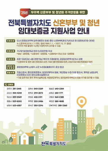 김형우 전북자치도 건설교통국장은 “신혼부부와 청년들이 경제적 부담 없이 안정적으로 거주할 수 있도록 적극 지원하겠다”며, “앞으로도 청년과 신혼부부의 정착을 돕고, 보다 나은 주거환경을 조성하는 데 최선을 다하겠다”고 밝혔다.