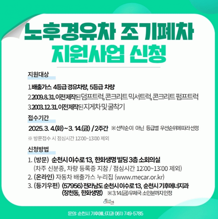 지원대상은 4등급 경유차, 5등급 차량, 2009. 8. 31. 이전 배출허용기준을 적용받아 제작된 도로용 3종 건설기계(덤프트럭·콘크리트믹서트럭·콘크리트펌프트럭), Tier-1 이하 엔진을 탑재한 지게차 및 굴착기이며, 순천시에 6개월 이상 등록된 차량을 대상으로 차종․연식․형식 등에 따라 보조금을 차등 지원한다.
