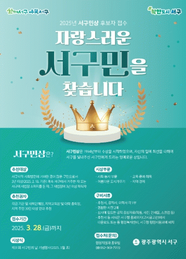 서구민상 후보자는 공고일(2월 18일) 기준 3년 이상 서구에 거주 중인 주민으로 동일한 공적으로 상을 받은 경력이 없어야 한다. 후보자 추천 기한은 3월 28일까지며 서구청 행정지원과(062-360-7913)에 관련 서류를 접수하면 된다.