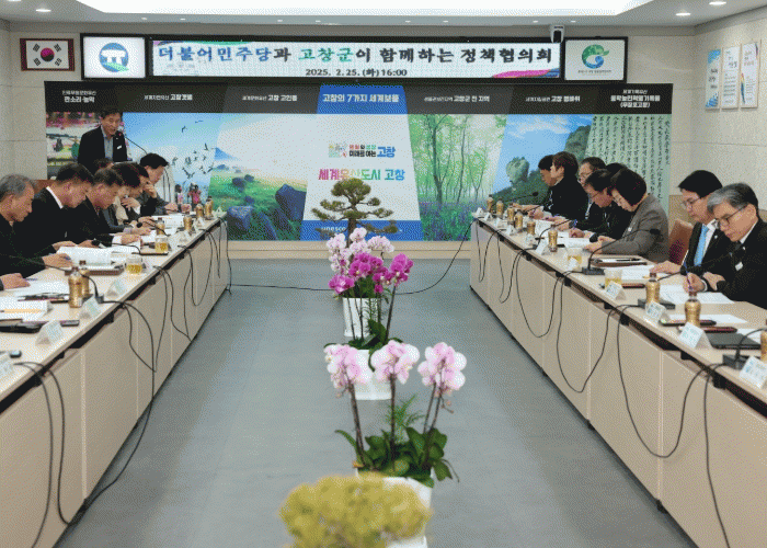 25일 고창군에 따르면 이날 오후 4시 고창군청 2층 회의실에서 ‘고창군-더불어민주당 지역위원회 정책협의회’가 열렸다. 정책협의회에는 심덕섭 고창군수와 윤준병 국회의원, 조민규 고창군의회 의장을 비롯한 군의원, 전북특별자치도의회 김만기 도의원·김성수 예산결산특별위원장 등이 참석했다.