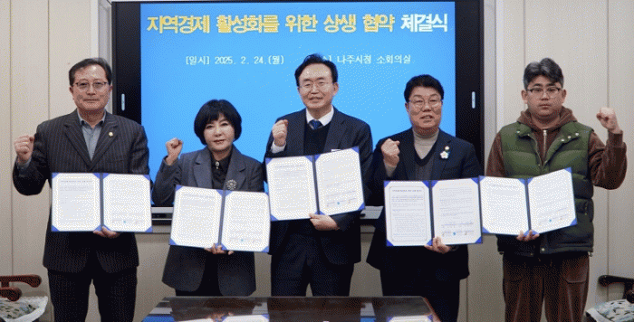전라남도 나주시는 지난 24일 나주시의회, 한국외식업중앙회·대한미용사회 나주시지부, 공공배달앱 먹깨비 대표 관계자와 ‘지역경제 활성화를 위한 상생 협약식’을 가졌다고 25일 밝혔다.