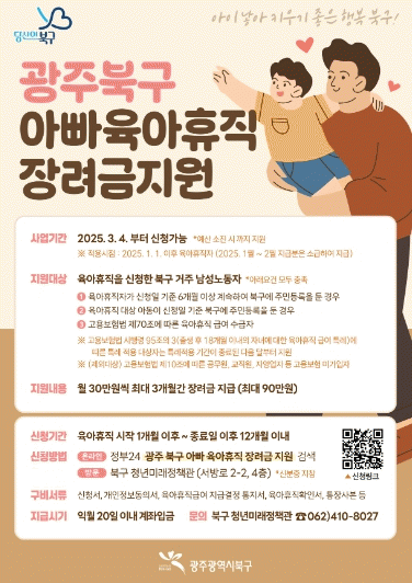 ‘아빠 육아휴직 장려금’ 지원은 아이 낳아 키우기 좋은 북구 조성사업의 일환으로 육아휴직 중인 남성 노동자에게 월 30만 원의 장려금을 최대 3개월간 지급하여 휴직에 따른 경제적 부담을 완화하고 남성의 육아휴직을 장려하고자 북구에서 올해 처음 추진하는 시책이다.