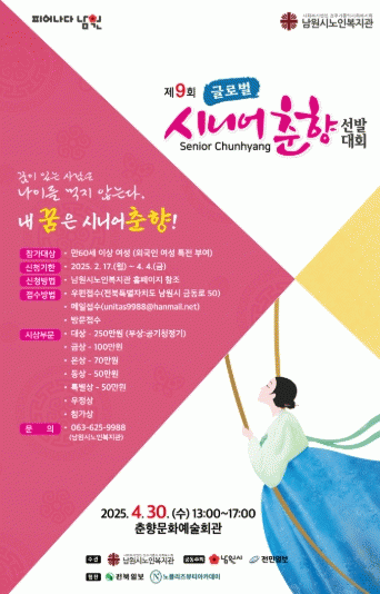 또한, 작년에 이어 참가대상 기준을 기존 60세이상(1965.4.30.이전 출생) 여성에서 55세이상(1970.4.30.이전 출생) 외국인 여성과 다문화 여성까지 확대해 글로벌과 시니어를 결합한 남원만의 특색있는 지역축제로의 자리매김에 나선다.