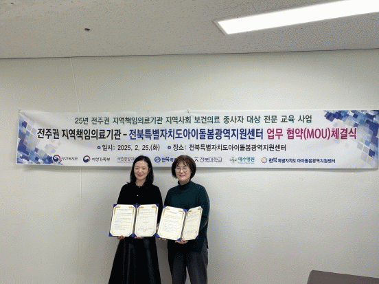 도 관계자는 “전주 예수병원과의 업무협약을 축하하며, 이번 협약이 영유아 건강증진과 안전한 돌봄 환경 조성에 큰 도움이 되길 바랍니다”라고 말했다.