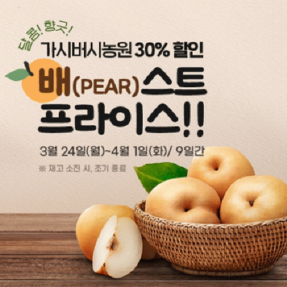 할인 품목은 배 단일 품목으로, 곡성군 죽곡면 청정지역에서 정성껏 재배한 ‘곡성 심청배’를 30% 할인된 가격에 만나볼 수 있다. 본 기획전은 상품 소진 시 조기 종료될 수 있다.